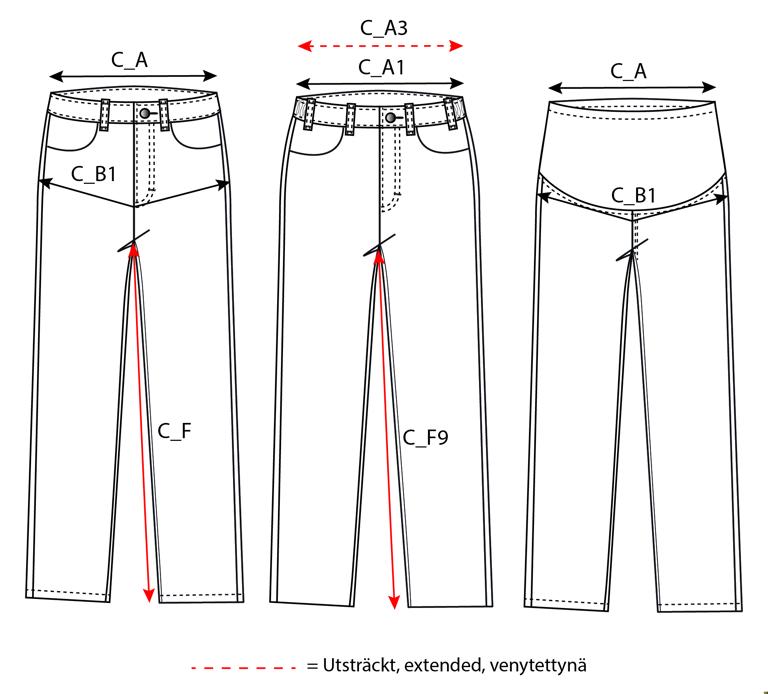 Äitiyshousut, joiden vyötärö on uurrettu ja jotka kasvavat vatsan mukana. Säädettävä leveys, jossa on nappeihin kiinnitettävä joustava kuminauha molemmilla sivuilla. Varustettu takataskulla ja molemmissa reisissä tuplareisitaskuilla.